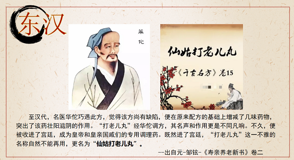 到了汉末,神医华佗与此方结下不解之缘。凭借其卓越的医学见识,华佗认为原方尚有完善的空间,于是增减数味药材,进一步强化滋阴壮阳的功效。经过华佗的改良,“打老儿丸”的功效更为显著,声名远扬,最终被纳入宫廷,成为皇亲国戚专用的调理药方。入宫后,由俗称的“打老儿丸”改为更为雅致的“仙姑打老儿丸”,完成了从民间秘方到宫廷珍品的第一次飞跃。